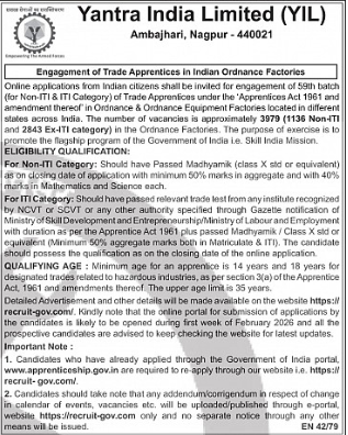 India Limited Bharti 2026. YIL Bharti 2026. Under Skill India Mission of Government of India Online applications are invited from Indian citizens for engagement of 59th Batch (for Non-ITI & ITI candidates) of Trade Apprentices Training under the Apprentices Act 1961 and amendments thereof in Ordnance & Ordnance Equipment Factories located in different States across India. Yantra India Limited Recruitment 2026 (Yantra India Limited Bharti 2026) for 3979 Apprentice (ITI & Non-ITI) Posts.